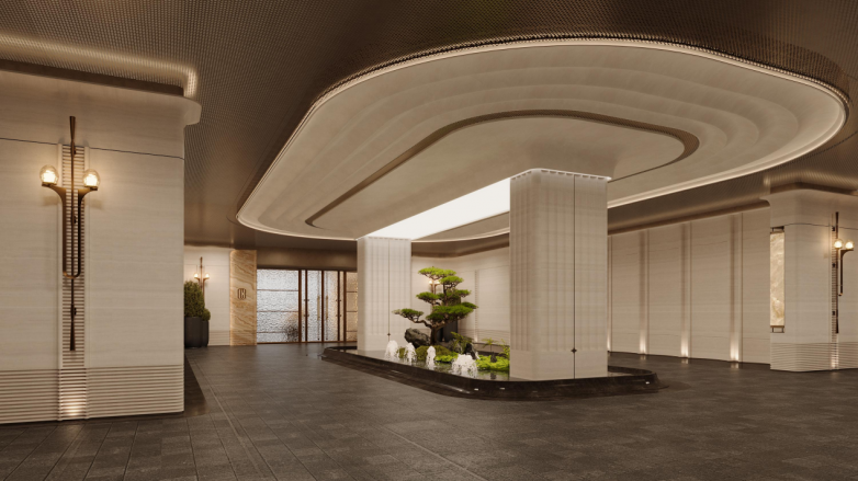 在归家动线上,SKY ONE以顶奢酒店的标准打造“五重归家礼序”。自媲美当代艺术馆的悬浮门庭和水景仪阵开始,8米高的艺术景墙、温润的透光玉石圆盘、超大尺度的悬浮圆弧顶,共同构成极具识别性的视觉IP;艺术风雨连廊贯穿整个中央园景,如同一条优雅的“航线”,让客户无论晴雨都能从容穿行于社区的每一处空间;环绕建筑架空首层的池面、绿意和“水上会客厅”,使待客之道犹如流动的心灵盛宴;从奢装双大堂到定制家徽的私家电梯厅,乃至被誉为“电梯界劳斯莱斯”的德国TKE(或同档次品牌)无感高速电梯,皆以至高礼遇和非凡气度盛迎归家。