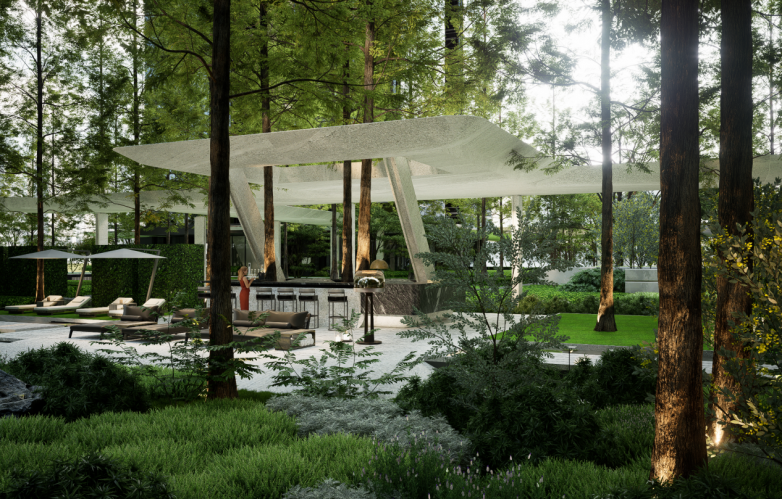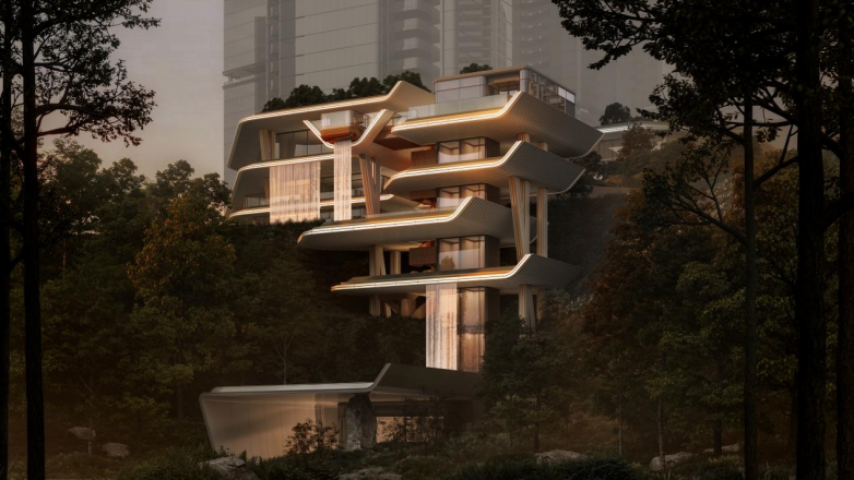 在近50米的原生台地高差之上,SKY ONE以错落、层叠、下沉、曲线等手法整体模拟自然之态,同时建筑首层以悬挑式抬板设计向上提升13米,让整栋建筑仿佛完全脱离了地面,轻盈地“漂浮”在森林与水景之上,形成了震撼的“反重力城市浮岛”形态。