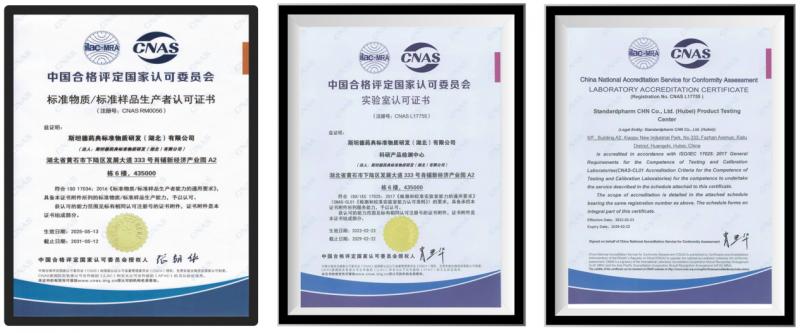 作为国内标准物质细分领域的优质企业,斯坦德拥有行业领先的资质优势:公司同时获得中国合格评定国家认可委员会(CNAS)的ISO17034标准物质生产者能力认证、ISO17025检测和校准实验室能力认证,双CNAS认证在全国范围内属于极其稀缺的存在,目前全国仅有44家机构持有 CNAS17034证书,华中地区仅斯坦德具备此项资质。此外,公司主导产品“药典级高纯度药物研发精准质控标准物质”,市场占有率已连续两年保持在17%以上,成为国产标准物质替代领域的标杆产品。