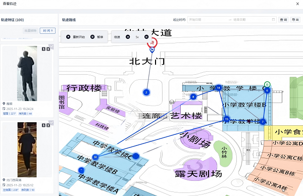 (2)轨迹一键生成:支持全域全时段检索,2分钟内生成完整行动轨迹,可快速定位学生位置;