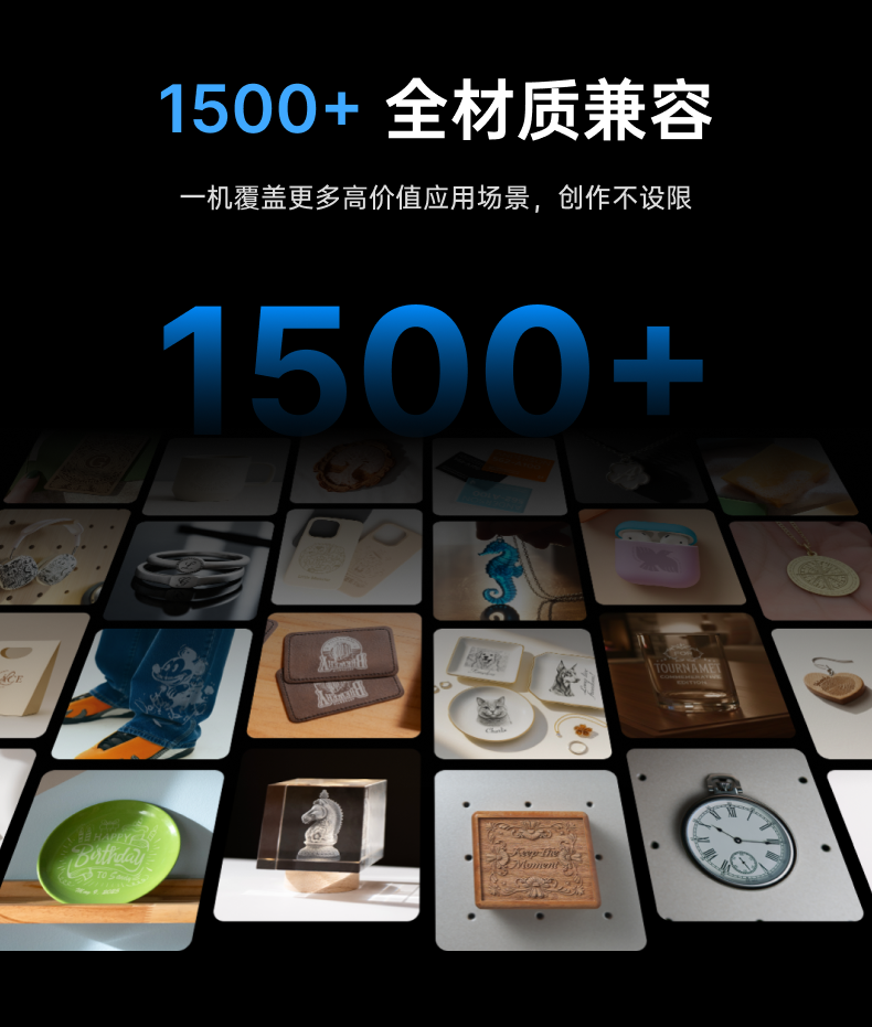 在材料适配能力方面,xTool UV 紫外激光雕刻机支持超过 1500 种材料加工,包括金属、陶瓷、皮革、玻璃、水晶、透明塑料、玉石及多种复合材料。