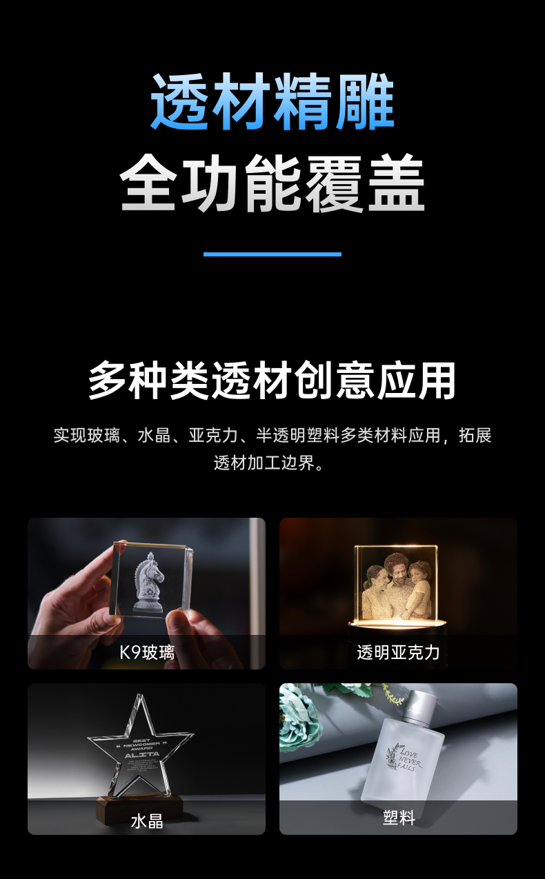 依托 UV 冷加工特性,新品支持桌面级透明材质 2D 与 3D 内部雕刻功能,可在K9玻璃等高透材料内部进行雕刻加工。相较于传统表面刻印工艺,透材内雕具备更强视觉表现力与长期保存特性。