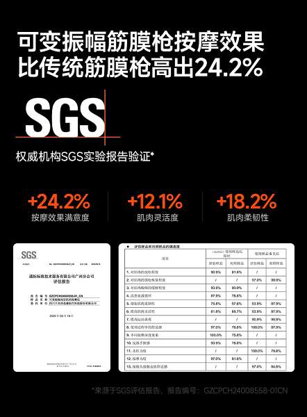 国际第三方检测机构SGS评估报告显示,相较于普通固定振幅筋膜枪,可变振幅筋膜枪对肌肉的即时放松程度提升9.1%,肌肉灵活性提升12.1%,肌肉柔韧性提升18.2%,用户满意度提升24.2%。