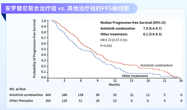 进一步比较安罗替尼联合治疗组与其他治疗组的疗效,2:1 PSM后,安罗替尼联合治疗组(n=404)的中位PFS为7.9个月,其他治疗组(n=203)为6.1个月(HR 0.72,95% CI:0.57-0.91;P=0.002)。两组的ORR分别为10.1%和11.8%。