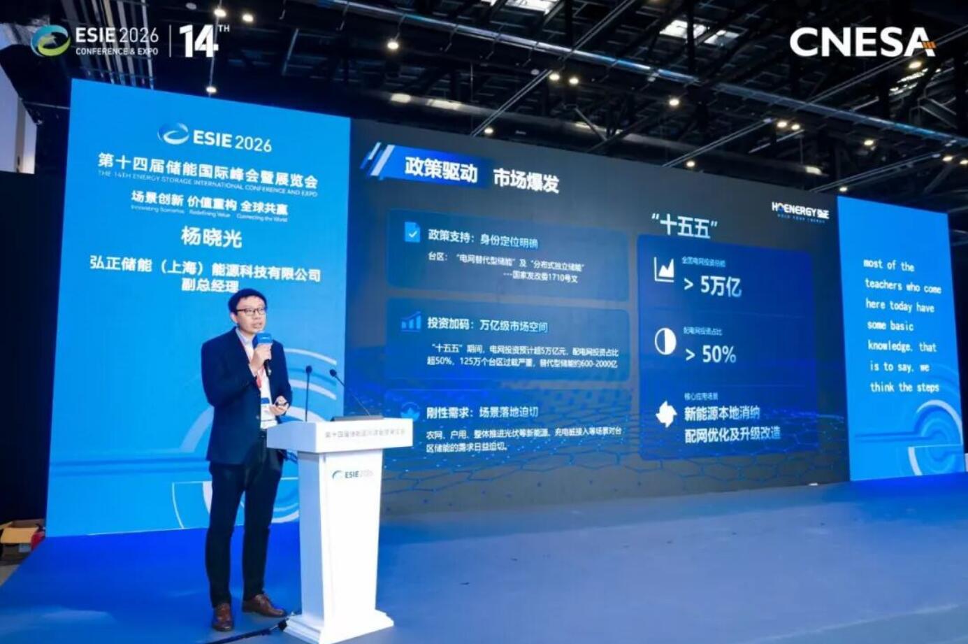 展会期间,弘正储能同步亮相多场主题活动,分享行业洞察与全球实践经验。在分布式光储主题论坛上,弘正储能杨晓光副总经理结合企业实践,深度解读136号文等相关政策落地影响,指出光储一体化将成为新能源产业发展的重要方向,并介绍了企业针对性推出的适配分布式光伏配储、台区储能等多元场景的定制化智慧能源解决方案,助力相关项目价值升级。