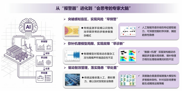 梁惠施认为,当前以大数据、大模型为代表的人工智能技术,为破解上述难题提供了全新思路。人工智能凭借其非线性特征提取能力,可深度挖掘时序关联,捕捉传统监测手段难以识别的电池早期复杂多维参数模式异常,实现“早预警”;同时,通过“数据驱动+物理机理”双驱动,可弥补纯机理模型在现场动态复杂工况与高噪声下的拟合局限,实现故障的“早诊断”;此外,通过深度融合垂直领域增强大模型和智能体架构,可基于诊断结果智能生成运维策略,落实故障“早处置”。将人工智能引入储能安全防控领域,能够将储能安全系统从一个“死板的报警器”,进化成一个“会思考的专家大脑”。