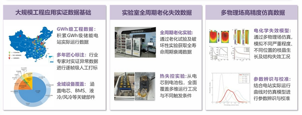 1)三位一体多元数据基座:针对故障样本稀缺的长尾分布难题,西清构建了“工程-实验-仿真”三位一体的数据基座:基于多年积累的GWh级储能电站实际运行数据,从海量数据中筛选异常样本,并进行专家级的人工标注;通过破坏性实验与老化实验获取极端故障与全生命周期老化失效数据;利用高精度多物理场仿真,模拟内短路等难以复现的故障。通过全方位交叉互补的数据基座,确保AI模型在工业场景下的有效性。