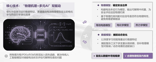 3)物理机理与多元AI双驱动数值分析内核:摒弃单纯AI“黑箱”模型,采用物理机理与数据模型双驱动技术路线。其核心是采用物理信息神经网络等先进算法,将等效电路、电化学、热力学等物理模型作为约束项嵌入AI损失函数,使AI推理既遵循物理规律,又能捕捉动态变化,实现可信的物理推理。