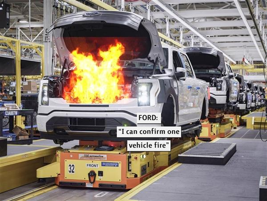再比如,近期因为F-150 Lightning在生产过程中发生电池起火事件,福特不得不暂停了F-150 Lightning的生产。而该车所使用的电池,来自福特合作伙伴SK Innovation的子公司SK On。