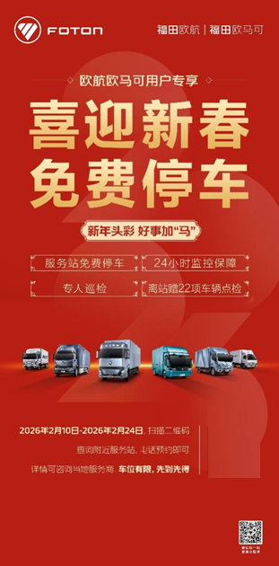 为了让卡友春节回家更踏实,福田欧航欧马可联动服务商,在全国范围内启动“喜迎新春 免费停车”客户关爱服务活动,从北方小年(2月10日)开始,一直延续到正月初八(2月24日),让卡友爱车有处安放。同时,针对春节依然坚守一线的卡友,欧航欧马可将同步启动 “春节不打烊”服务,做用户前行路上的可靠后盾。