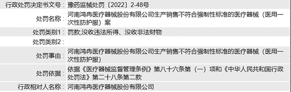 日前,河南省药监局发布的一则行政处罚信息显示,河南鸿冉医疗器械股份有限公司因生产销售不符合强制性标准的医疗器械(医用一次性防护服),被罚款40万元。