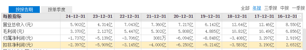此前,翰宇药业扣非净利已连亏7年。2018年至2024年,翰宇药业归属于上市公司股东的净利润分别为-3.41亿元、-8.85亿元、-6.09亿元、0.31亿元、-3.71亿元、-5.14亿元、-1.74亿元,归属于上市公司股东的扣除非经常性损益的净利润分别为-3.58亿元、-9.21亿元、-6.25亿元、-4.00亿元、-3.15亿元、-5.91亿元、-2.40亿元。