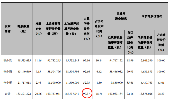 翰宇药业2024年11月14日披露的关于控股股东、实际控制人办理部分股票解除质押业务的公告显示,截止公告披露日,曾少贵、曾少强和曾少彬三兄弟质押股份数量为165,737,041股,占其所持股份比例的90.37%,占公司总股本比例的18.76%。