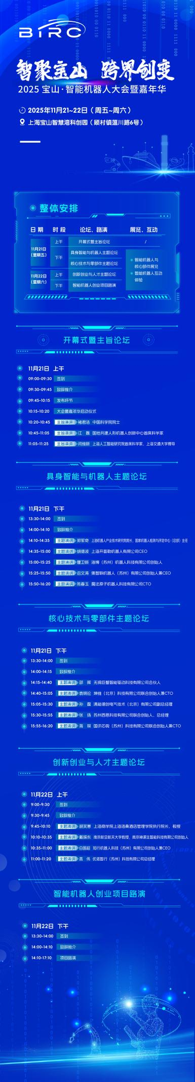 2025 年 11 月 21 日至 22 日,“2025 宝山·智能机器人产业大会暨嘉年华”将重磅来袭。本次活动不仅有顶尖专家坐镇的行业论坛、优秀项目汇聚的创业路演,更有明星企业云集的硬核展览,以及能摸能玩的互动体验,等你来解锁!