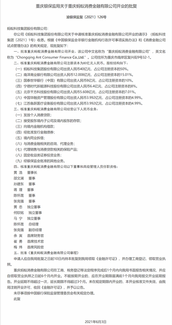 6月3日,市场关注已久的重庆蚂蚁消费金融有限公司获得重庆银保监局批复开业,公司首任董事长为黄浩。