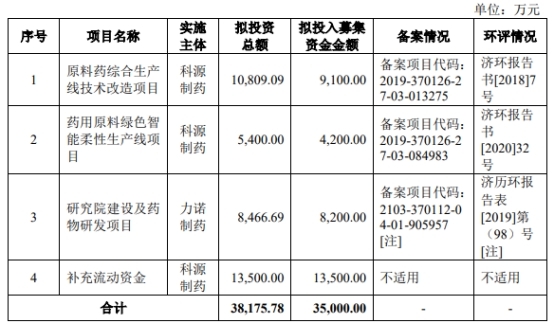 科源制药拟募资35,000.00万元,分别用于原料药综合生产线技术改造项目、药用原料绿色智能柔性生产线项目、研究院建设及药物研发项目、补充流动资金。