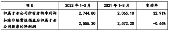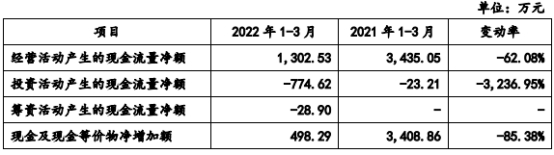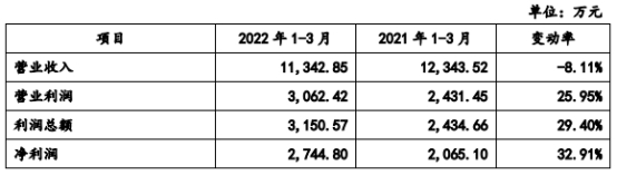 2022年1-3月,科源制药的营业收入为11,342.85万元,同比下降8.11%;净利润为2,744.80万元,同比增加32.91%;扣除非经常性损益后归属于母公司股东的净利润为2,555.30万元,同比降低0.66%;公司经营活动产生的现金流量净额为1,302.53万元,同比减少62.08%。