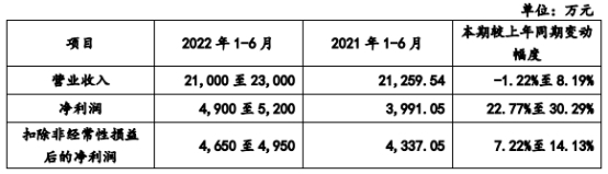 公司预计2022年上半年营业收入21,000至23,000万元,变动幅度-1.22%至8.19%;净利润4,900至5,200万元,变动幅度22.77%至30.29%;扣除非经常性损益后的净利润4,650至4,950万元,变动幅度7.22%至14.13%。