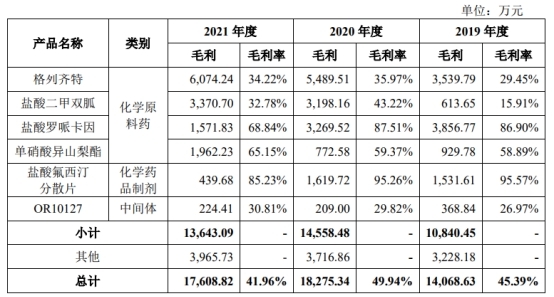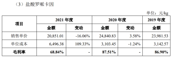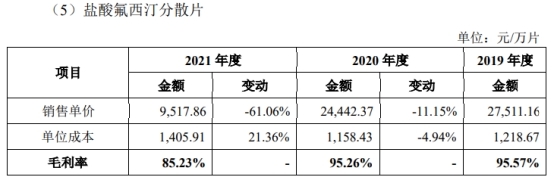 但其他产品如盐酸罗哌卡因的毛利率分别为86.90%、87.51%、68.84%,盐酸氟西汀分散片的毛利率分别为95.57%、95.26%、85.23%,持续下降。