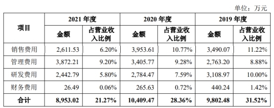 2019年至2021年,科源制药的研发费用分别为3,108.97万元、2,784.47万元、2,442.79万元,而同期的销售费用分别为3,490.07万元、3,953.61万元、2,611.53万元,均高于研发。