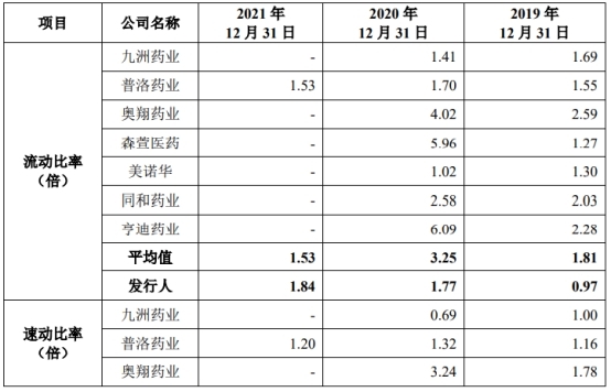 2019年至2021年,科源制药的资产负债率(合并)分别为45.38%、25.49%、22.97%,流动比率分别为0.97、1.17、1.84,速动比率分别为0.69、1.06、1.06。