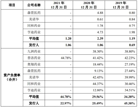 上述同期,同行业可比公司的资产负债率均值为34.38%、29.56%、44.78%,流动比率均值分别为1.81、3.25、1.53,速动比率均值分别为1.19、2.39、1.20。