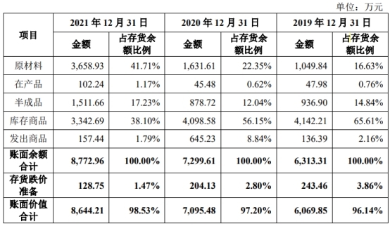 2019年至2021年各期末,科源制药的存货账面价值分别为6,069.85万元、7,095.48万元和8,644.21万元,占各期末总资产比重分别为12.13%、15.47%和15.45%。公司存货跌价准备分别为243.46万元、204.13万元和128.75万元。