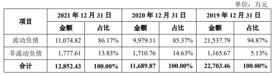 上述同期,公司的负债合计22,703.46万元、11,689.87万元、12,852.43万元,其中流动负债分别为21,537.79万元、9,979.11万元、11,074.82万元。