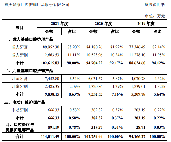 而在漱口水、电动牙刷等品类方面,登康口腔的相关产品营收规模还未形成,招股书显示,2021年登康口腔电动牙刷收入为666.33万元,口腔医疗与美容护理等产品891.19万元,占营收比例分别为0.58%、0.78%。