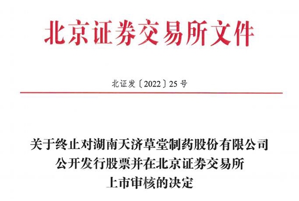 北交所《关于终止对湖南天济草堂制药股份有限公司公开发行股票并在北京证券交易所上市审核的决定》显示,6月12日西部证券向北交所提交了《西部证券股份有限公司关于湖南天济草堂制药股份有限公司撤回北交所上市申请材料的请示》,北交所于13日决定终止天济草堂公开发行股票并在北京证券交易所上市的审核。据悉,这是北交所首家临上会前夕被直接终止审核的公司。