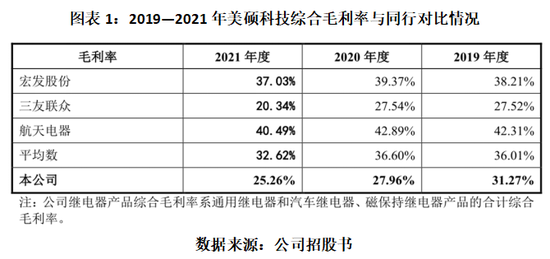报告期内,美硕科技的综合毛利率分别为31.27%、27.96%、25.26%,逐年下滑。该公司将宏发股份、三友联众、航天电器列为同行可比竞争对手,上述三家企业的综合毛利率均值分别为36.01%、36.6%、32.62%。