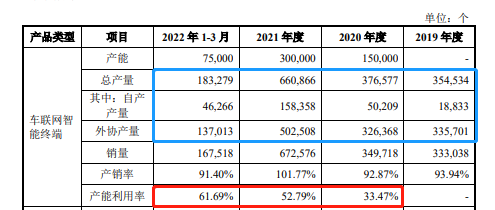 此外,2020-2021年及2022年一季度,慧翰股份车联网智能终端的产销率基本保持在90%以上,但产能利用率分别为33.47%、52.79%、61.69%。