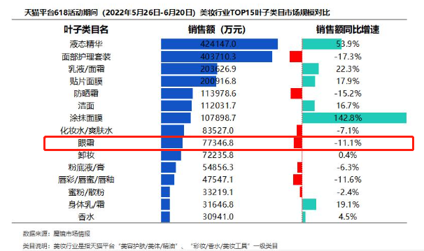 然而,相较于其他面部护理产品,眼霜市场占比不大,产品销量存在天花板偏低的情况。魔镜市场情报数据显示,2022年618活动期间,眼霜产品在天猫平台的销售额为7.73亿元,位于美妆行业TOP15叶子类目销售额的第9位。