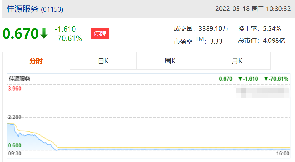 今日早间,佳源国际以0.99港元的价格低开,此后其股价断崖式下跌,截至停牌跌幅达到41.41%,总市值28.48亿港元。佳源服务跌幅更深,其以1.96港元的价格开盘,截至停牌股价已跌至0.67港元,跌幅70.61%,总市值仅剩4.1亿港元。