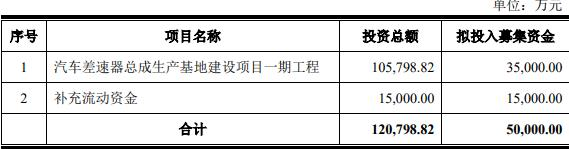 公司公开发行可转换公司债券募集资金总额(含发行费用)为5亿元(含5亿元),扣除发行费用后,将投资于汽车差速器总成生产基地建设项目一期工程、补充流动资金。