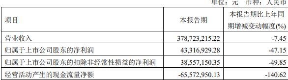 据公司2023年第一季度报告,报告期内,公司实现营业收入3.79亿元,同比减少7.45%;归属于上市公司股东的净利润4331.69万元,同比减少47.15%;归属于上市公司股东的扣除非经常性损益的净利润3855.72万元,同比减少49.85%;经营活动产生的现金流量净额-6557.30万元,同比减少140.62%。
