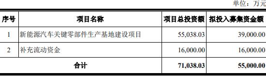 公司本次发行拟募集资金总额不超过55000.00万元(含55000.00万元),扣除发行费用后,募集资金拟投资于新能源汽车关键零部件生产基地建设项目、补充流动资金。