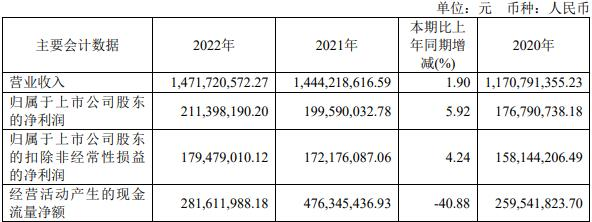 据豪能股份2022年年报,报告期内,公司实现营业收入14.72亿元,同比增长1.90%;归属于上市公司股东的净利润2.11亿元,同比增长5.92%;归属于上市公司股东的扣除非经常性损益的净利润1.79亿元,同比增长4.24%;经营活动产生的现金流量净额2.82亿元,同比减少40.88%。