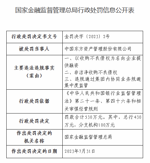 今日,国家金融监督管理总局网站更新行政处罚信息显示,中国东方资产管理股份有限公司因以收购不良债权为名向企业提供融资;非洁净收购不良债权;违规通过集团内协同业务规避集中度监管,被国家金融监督管理总局罚款合计530万元。其中,总行430万元,分支机构100万元。作出处罚决定的日期显示为2023年7月31日。