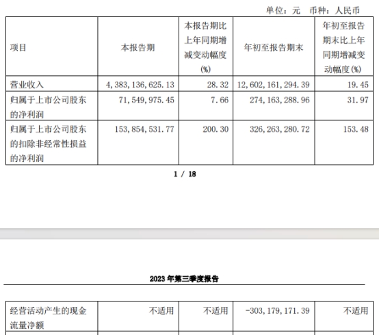 2023年前三季度,公司实现营业收入126.02亿元,同比增长19.45%;实现归属于上市公司股东的净利润2.74亿元,同比增长31.97%;实现归属于上市公司股东的扣除非经常性损益的净利润3.26亿元,同比增长153.48%;经营活动产生的现金流量净额为-3.03亿元。