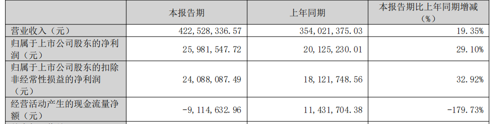 贝斯美2025年一季度报告显示,报告期内,公司实现营业收入4.23亿元,同比增长19.35%;归属于上市公司股东的净利润2598.15万元,同比增长29.10%;归属于上市公司股东的扣除非经常性损益的净利润2408.81万元,同比增长32.92%;经营活动产生的现金流量净额为-911.46万元,上年同期为1143.17万元。