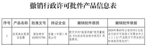 撤销行政许可批件产品信息表显示,宝芙焕白柔滑洁容霜(批准文号:国妆特字G20151784)被撤销行政许可批件,持证企业为宝健(中国)有限公司。撤销批件原因为配方中的“羟苯丙酯”使用量超出《化妆品安全技术规范》限值要求,撤销批件依据为2019年第45号公告附件1化妆品行政许可延续工作要求中三(二)2.“产品配方不符合现行标准规范规定的”。