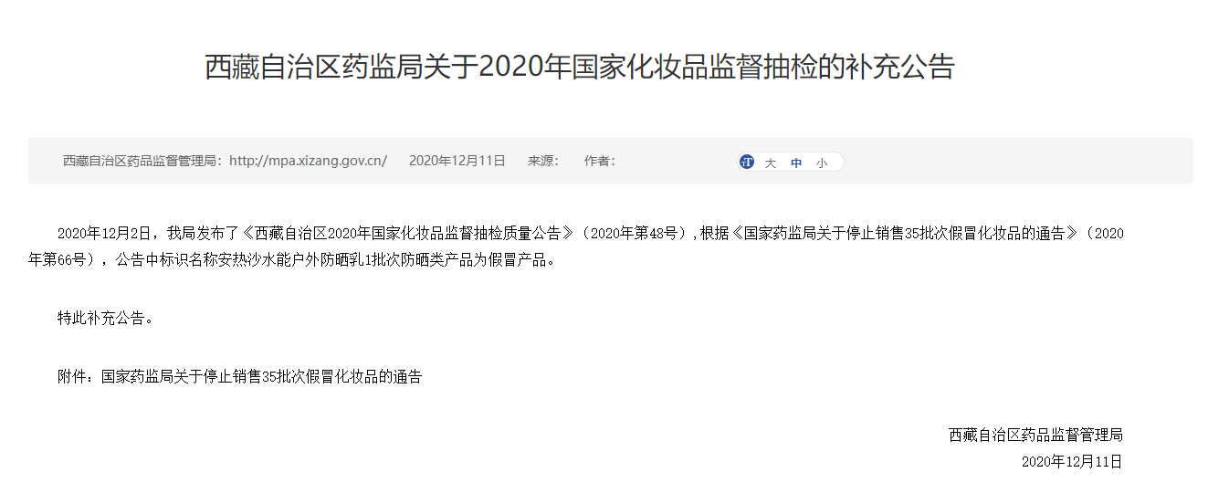 2020年12月11日,西藏自治区药品监督管理局网站发布关于2020年国家化妆品监督抽检的补充公告。原文如下:2020年12月2日,我局发布了《西藏自治区2020年国家化妆品监督抽检质量公告》(2020年第48号),根据《国家药监局关于停止销售35批次假冒化妆品的通告》(2020年第66号),公告中标识名称安热沙水能户外防晒乳1批次防晒类产品为假冒产品。