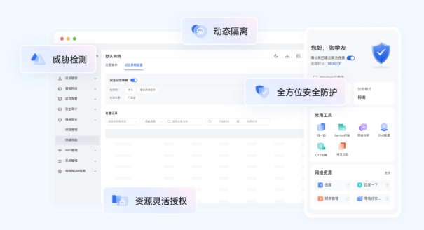 动态处置与自动隔离: 支持设置威胁动态处置策略。一旦检测到组网内的某个终端存在高危风险(如僵尸网络活动、恶意软件通信),系统将自动把该威胁终端从组网中隔离,瞬间切断其横向渗透路径,确保企业核心数据资产不受牵连。