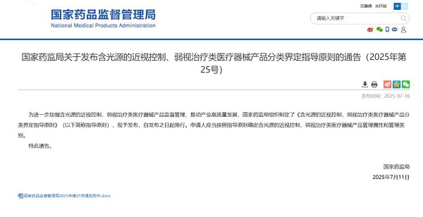 2025年7月,国家药监局发布《含光源的近视控制、弱视治疗类医疗器械产品分类界定指导原则》,明确将LED光源红光产品纳入二类医疗器械管理,分类编码16-03,在此时间后获批的产品才是真正合规的医疗器械产品。