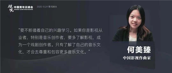 何美臻表示,影视业的从业者,不仅要了解影视,还要多了解音乐和文化背景,这样才能成为一个真正的戏剧创作者,才会去尊重更多和包容更多的音乐的文化。