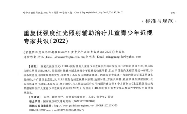 4.上海市眼病防治中心《重复低强度红光照射辅助治疗儿童青少年近视专家共识》