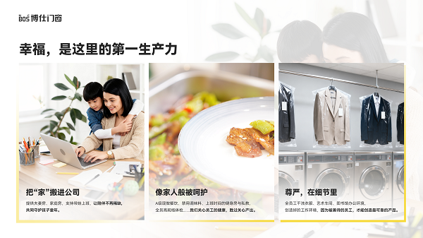 “好的环境造就优秀的人才,优秀的人做出优秀的产品”,博仕门窗的理念体现在“家文化”中:提供夫妻房、家庭房,允许员工接父母、孩子到公司一起生活,提供食宿并解决子女教育问题。