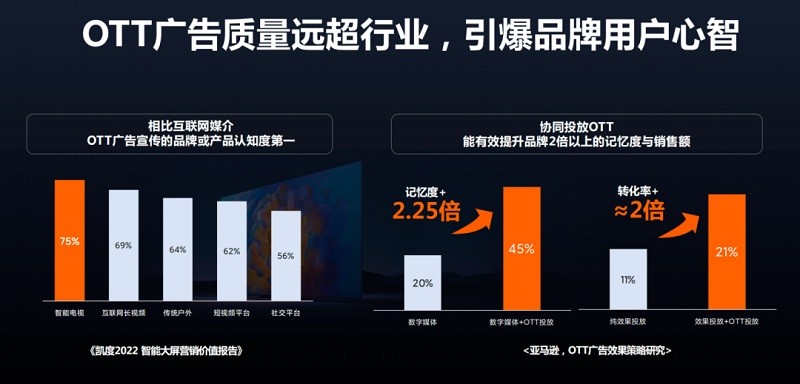 OTT大屏的媒介特性决定了它更适合优质广告内容的展示,结果就是OTT广告质量整体较高,流量x质量结合就是更好的“达标率”。《凯度2022 智能大屏营销价值报告》显示,相比互联网媒介OTT广告宣传的品牌或产品认知度第一。《亚马逊,OTT广告效果策略研究》发现,在数字媒体基础上协同投放OTT广告,可有效提升品牌2倍以上的记忆度与销售额。