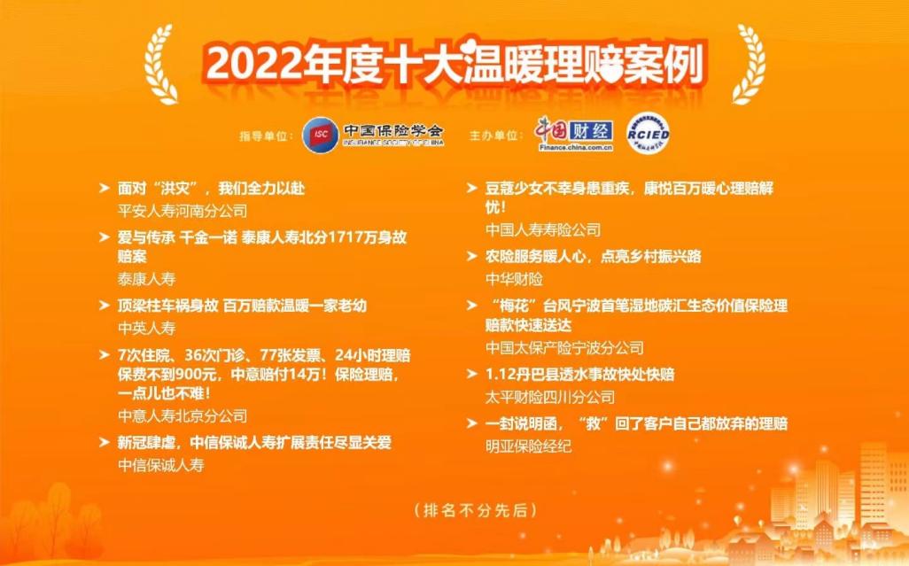 近日,由中国保险学会指导,中国网财经、中国社会科学院保险与经济发展研究中心联合主办的“2022年度十大温暖理赔案例发布会暨进一步提升保险理赔服务满意度研讨会”在京举办,会上公布了“2022年度十大温暖理赔案例征集活动”评选结果。中英人寿的“顶梁柱车祸身故,百万赔款温暖一家老幼”案例成功入选,让保险的价值被看见。